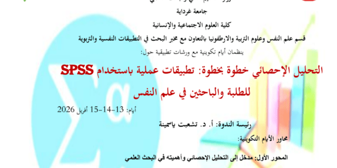 إعلان عن تنظيم أيام تكوينية في برنامج SPSS – قسم علم النفس 12 مارس 2026 إعلانات, الحياة الجامعية, مقالات مميزة, نشاطات الكلية 181 زيارة SPSS شاركها Facebook Twitter LinkedIn