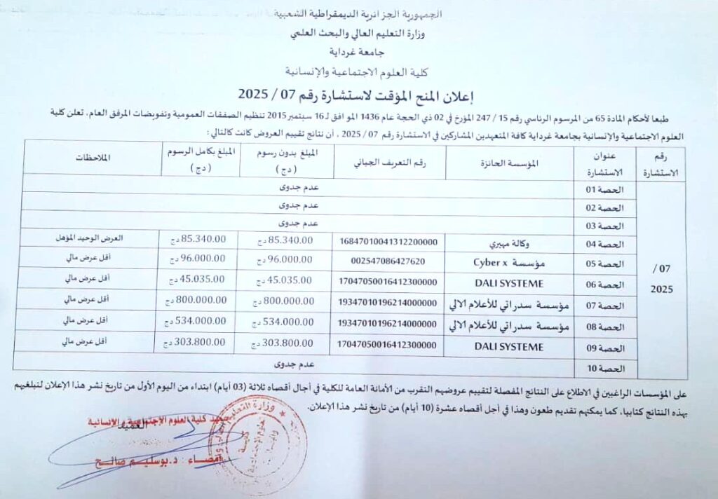 تعلن كلية العلوم الاجتماعية والإنسانية بجامعة غرداية بعد تقييم العروض المقدمة من المشتركين عن المنح المؤقت للاستشارة رقم 07 / 2025 كالتالي: