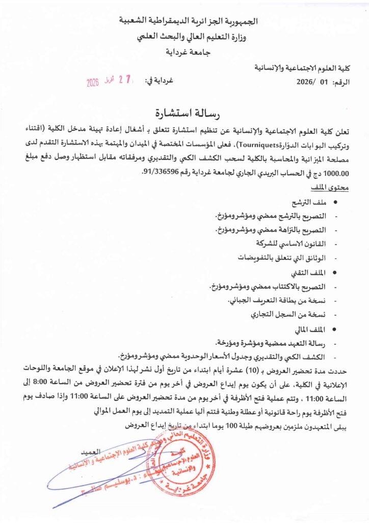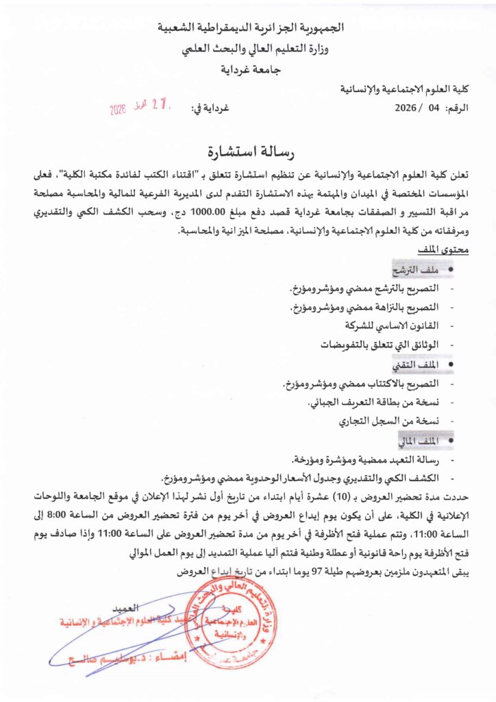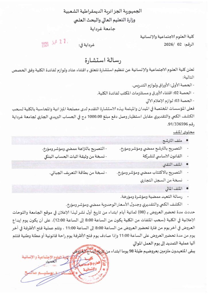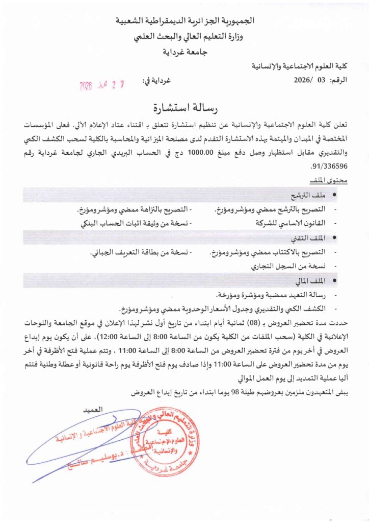 تعلن كلية العلوم الاجتماعية والانسانية بجامعة غرداية عن تنظيم استشارة. التفاصيل في الإعلان ادناه